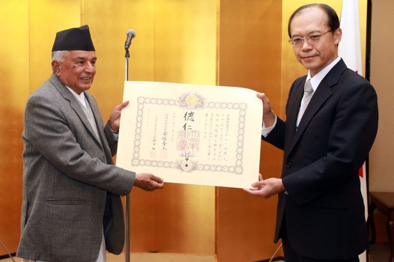 काठमाडौँ: नेपाली कांग्रेसका वरिष्ठ नेता एवं पूर्वसभामुख रामचन्द्र पौडेललाई जापान सरकारले राजकीय सम्मानले विभूषित गरेको छ । सन् २०२० अप्रिल २९ मा घोषणा भएको उक्त सम्मान उहाँलाई आज जापानी राजदूतको निवासमा विशेष कार्यक्रम गरी प्रदान गरिएको हो ।