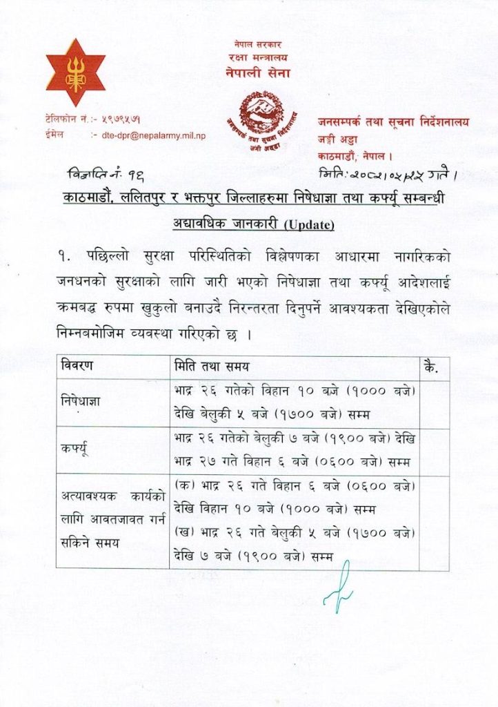 विहीबारका लागि सेनाले बिहान १० बजेदेखि साँझ ५ बजेसम्म निषेधाज्ञा र बेलुका ७ बजेदेखि २७ गते शुक्रबार बिहान ६ बजेसम्म कर्फ्यू आदेश जारी गरेको बियाप्तिमा भनिएको छ ।