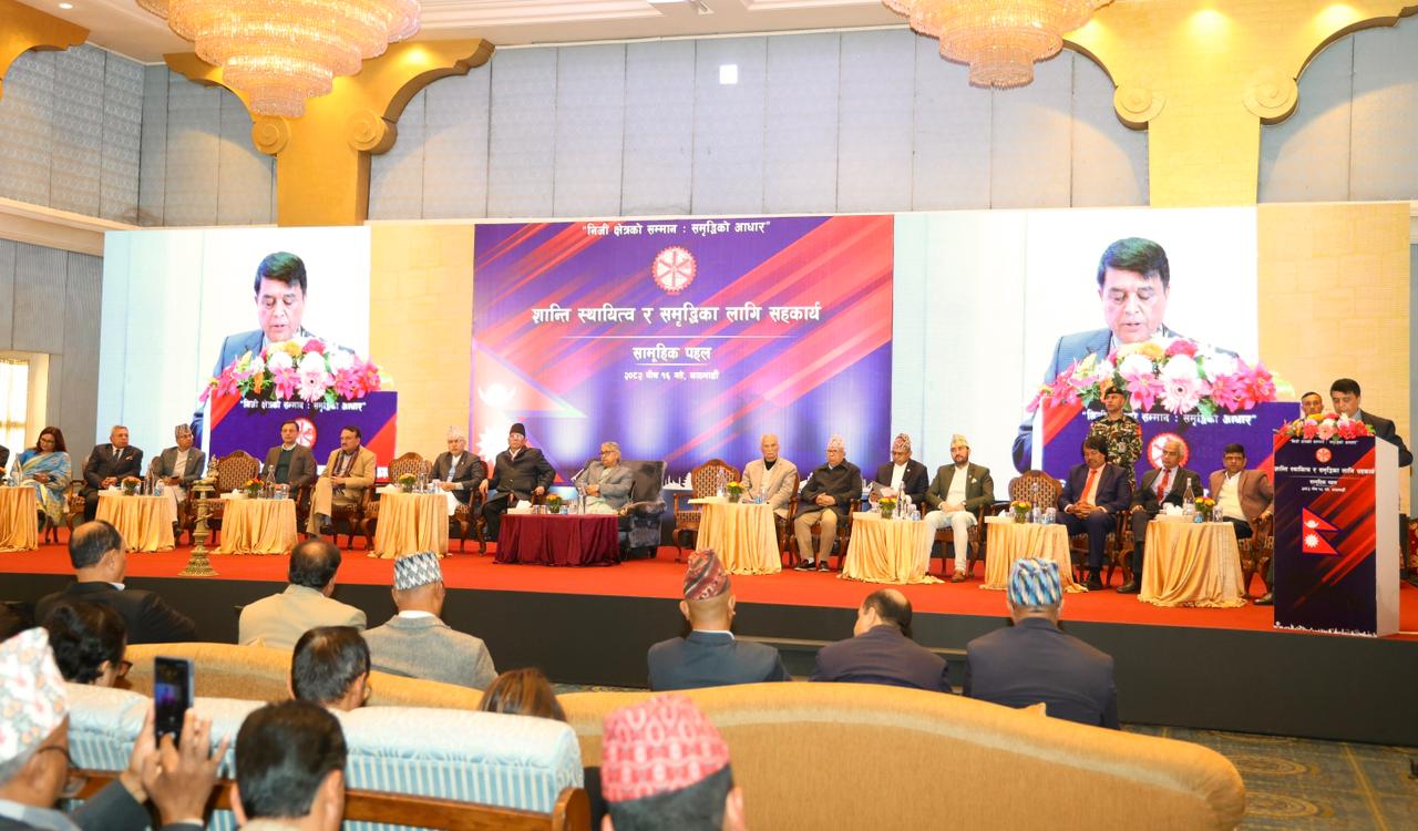 शान्ति स्थायित्व र समृद्धिका लागि सहकार्य विषयक सामूहिक पहल कार्यक्रममा बोल्दै अध्यक्ष ढकालले निजी क्षेत्र सुरक्षित र सम्मानित नभएसम्म मुलुकमा लगानी, रोजगारी र आर्थिक वृद्धि सम्भव नहुने स्पष्ट पारे।